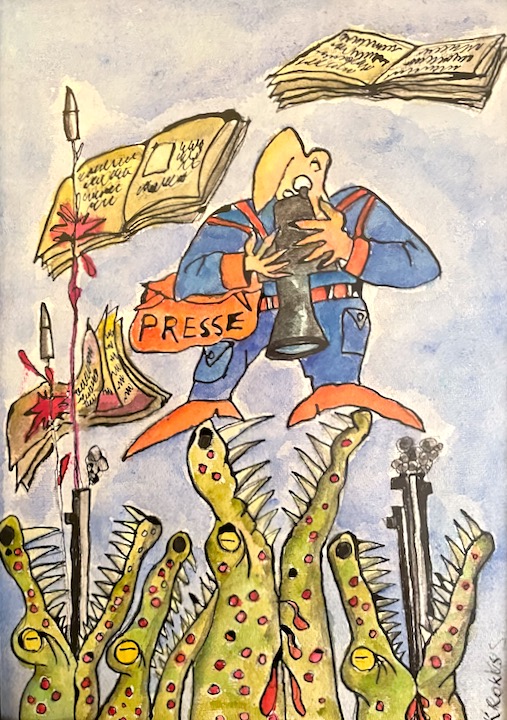 Au fil des décennies, Philippe Krokus a développé une pratique artistique riche et variée, mêlant dessin de presse et création picturale en participant parallèlement à des expositions dans des galeries et espaces culturels parisiens et ailleurs.
