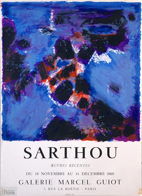 Affiche Maurice-Elie Sarthou, exposition Galerie Marcel Guiot, Paris 1969, Lithographie Mourlot sur vélin léger, traces d'adhésif, Bon état
