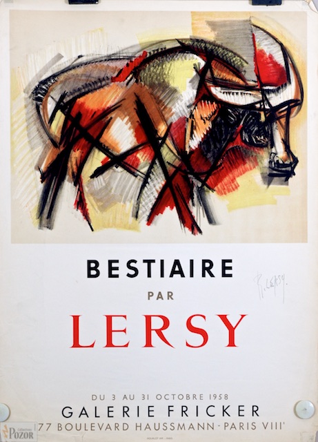 Affiche Roger Lersy, exposition Bestiaire, Galerie Fricker, Paris 1958, "Taureau", création originale, Lithographie Mourlot sur vélin léger, signée au crayon, froissements, traces, accrocs, petit manque coin, Assez bon état