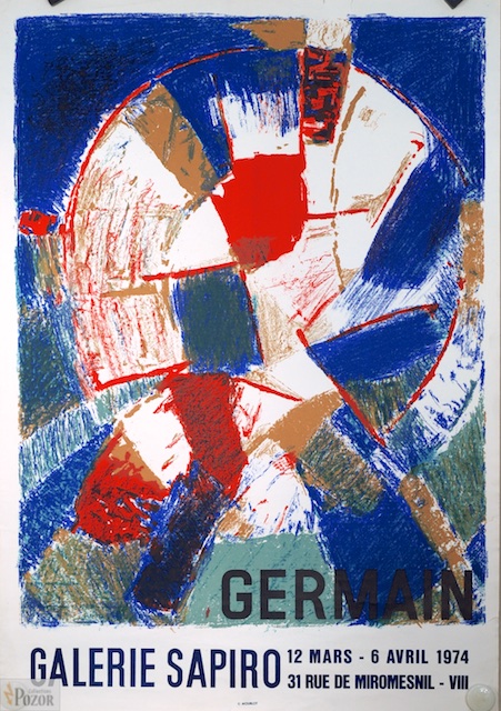 Affiche Jacques Germain, exposition Galerie Sapiro, Paris 1974, Création originale, Lithographie Mourlot sur Vélin léger, petites déchirures bords, Très bon état