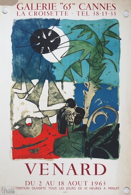 Affiche Claude Venard, exposition Galerie 65, Cannes 1963, Création originale (CR Mourlot Affiches) Lithographie Mourlot sur vélin, Manque coin, jaunissement, Assez bon état