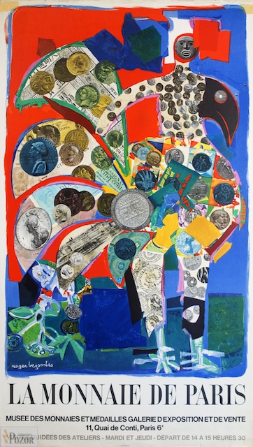 Affiche Roger Bezombes, Musée des Monnaies et Médailles, Paris 1970, Création originale (CR Mourlot Affiches), Lithographie Mourlot sur vélin léger, froissements, traces dont adhésif, petits accrocs, Assez bon état
