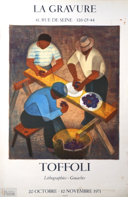 Affiche d'exposition de Louis Toffoli "Lithographies, Gouaches", Galerie La Gravure, Paris 1971 "Oursins bleus", création originale, Lithographie Mourlot sur vélin léger (CR Mourlot affiches)