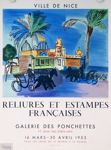 Affiche de l'exposition "Reliures et estampes françaises", Galerie des Ponchettes, Nice 1953, d'après Raoul Dufy "Le Casino de la jetée", Nice 1927Lithographie Mourlot sur Vélin léger (CR Mourlot Affiches)