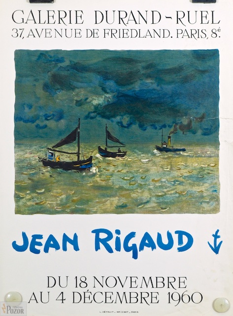 Affiche Jean Rigaud, exposition Galerie Durand-Ruel, Paris 1960, Pêche nocturne, création originale, Lithographie Détruit sur vélin léger, déchirures 7 et 1cm stoppées, Etat d'usage