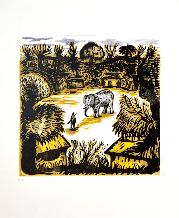 Olivier Besson, "Eléphant au village", 2022Gravure bois 28x28 cm sur vélin fort 38x56 cm, signée et numérotée EA à la main par l'artiste