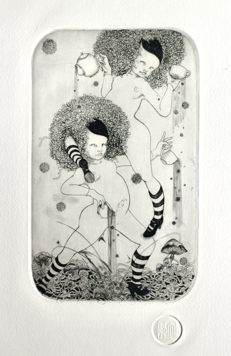 Miyako Ito "Tea party", 2014Gravure talle douce 13x22 sur vélin fort 20x30 cm, signée et numérotée sur 13 ex à la main par l'artiste