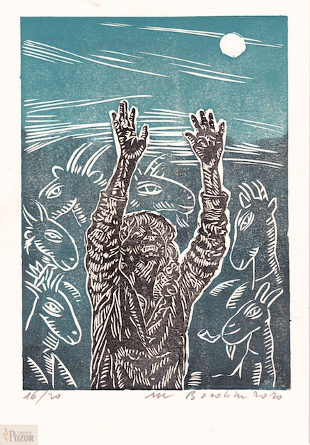 Mauro Bordin "Réponse à Chagall" Estampe originale linogravée sur vélin fort, signée main et numérotée sur 20 exemplaires, cachet à sec éditeur, Editions Pozor 2020