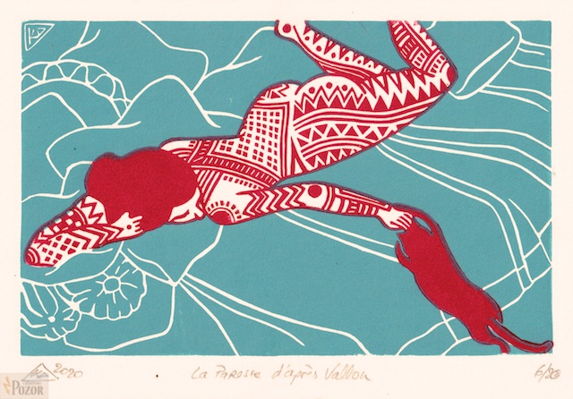 Ka "La Paresse" Réponse à Vallotton, Estampe originale linogravée sur vélin fort, signée main et numérotée sur 20 exemplaires, cachet à sec éditeur, Editions Pozor 2020