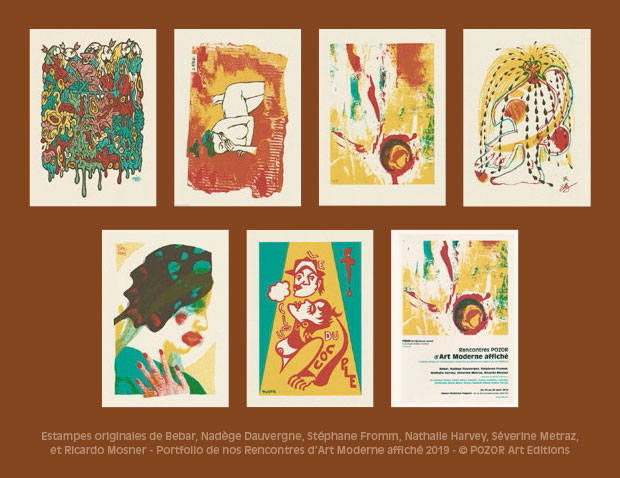 Affiche des Rencontres Pozor 2019 à l'Espace Christiane Peugeot et estampes individuelles signées et numérotées des artistes, également disponibles