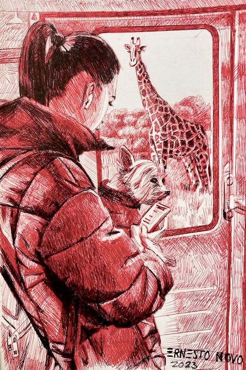 Ernesto Novo "Rêve de girafe" 2023 Dessin au stylo bille sur papier d'art fort, signé et daté main par l'artiste
